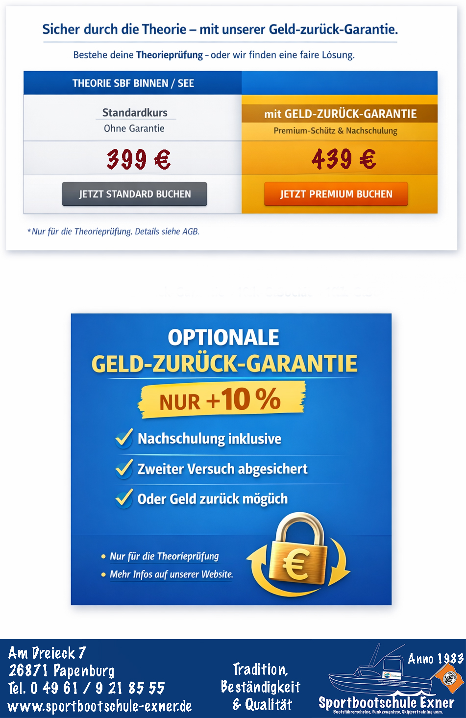 Unsere Geld-zurück-Garantie für die Theorieprüfung ist eine freiwillige Zusatzleistung, die du optional zu deiner Theorieausbildung zum Sportbootführerschein Binnen oder See hinzubuchen kannst.