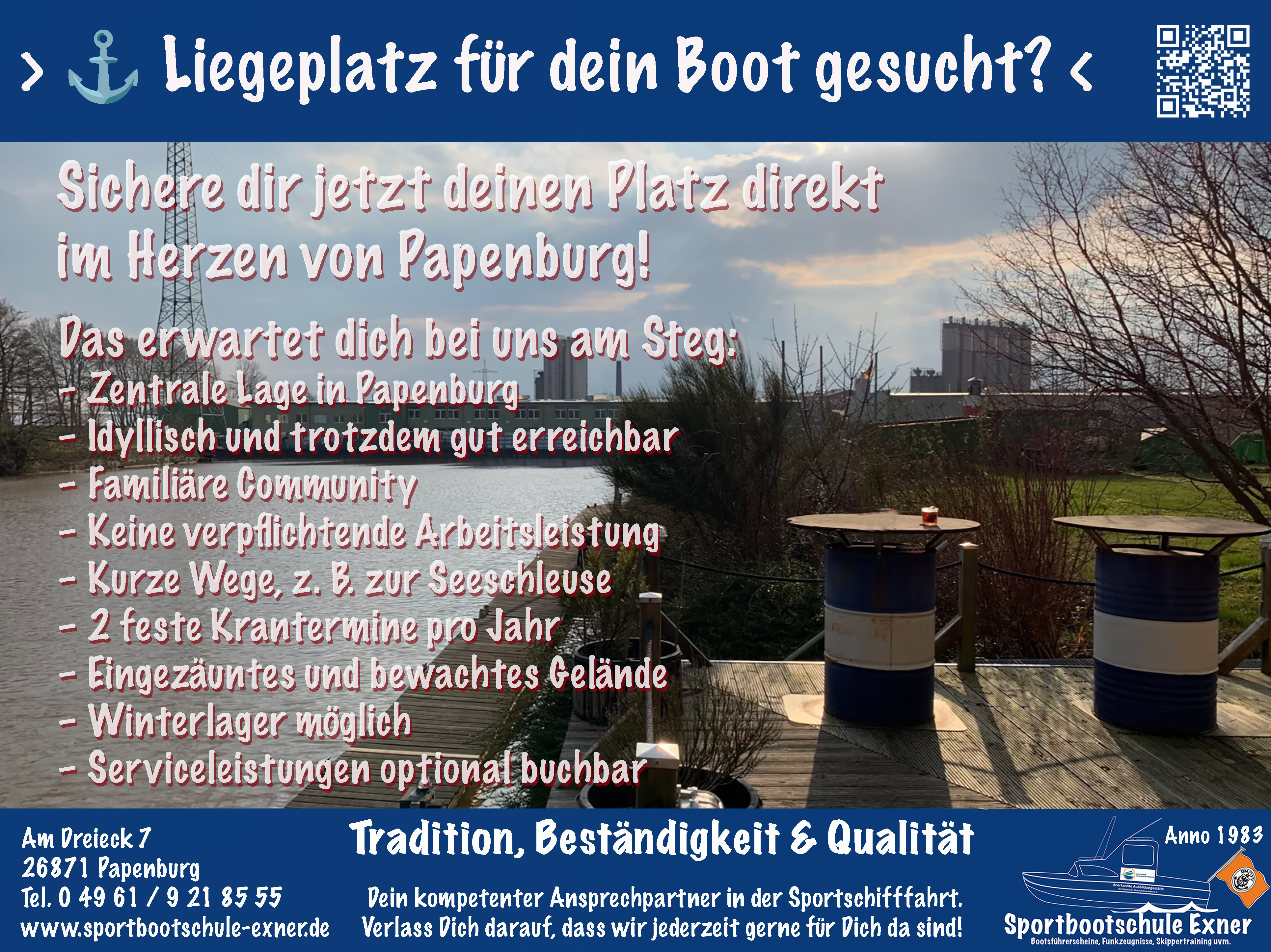 Mitten im Herzen von Papenburg gelegen, profitieren Sie von kurzen Wegen – unter anderem zur Seeschleuse. Das Gelände ist eingezäunt und bewacht, sodass Ihr Boot sicher liegt. Zwei feste Krantermine pro Jahr erleichtern das Ein- und Auskranen.